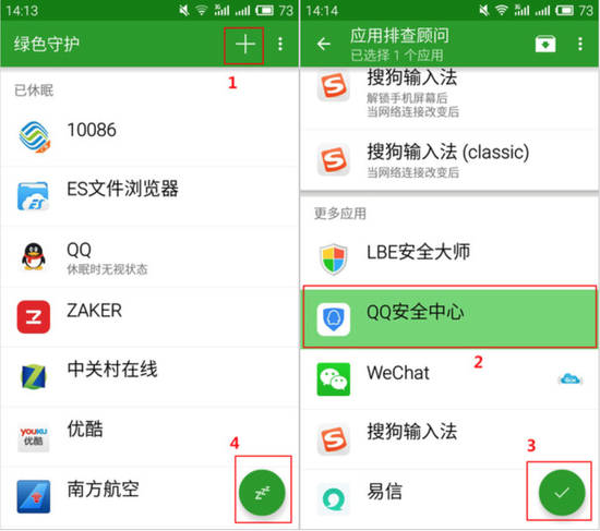 對已經獲取了root權限的用戶,除了一般的自啟管理軟件之外還可以搭配綠色守護使用,我們安裝綠色守護後選擇右上角的“+”,然後選擇需要休眠的應用程序,選擇完畢後按右下角的“√”,然後再按“Zz”即可完成程序的休眠,若發現程序正在運行,則選擇無視程序狀態進行休眠即可。(已root的用戶可選擇不同的自啟管理軟件,無需局限於LBE與360極客版)