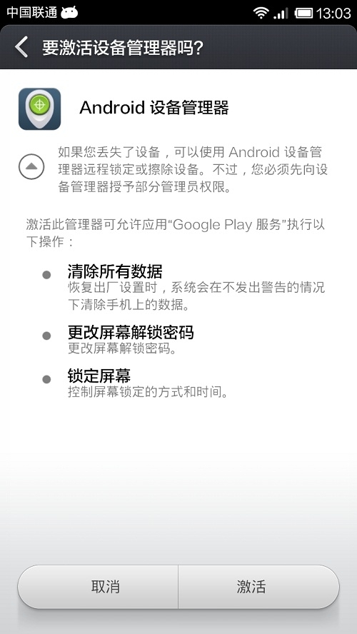 在功能表-設置-安全-設備管理器裡激活“Android設備管理器”