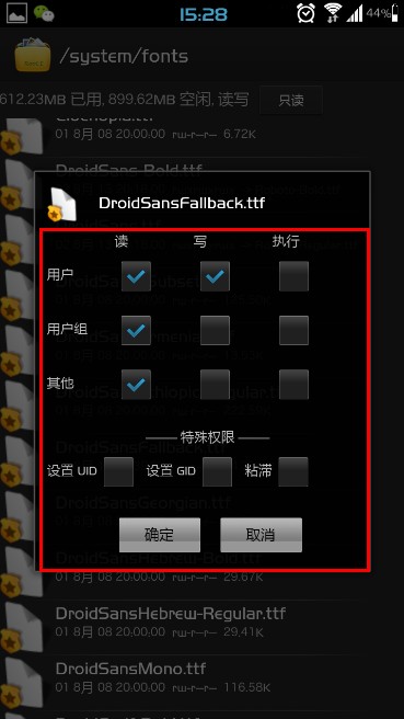 把字體名字改為“DroidSansFallback.ttf”拷貝到手機或者內存卡裡,然後在手機上打開RE文件管理器,找到字體文件,復制或者移動到:system然後更改權限如圖,更改權限後再將字體文件移動到fonts 文件夾內,如提示覆蓋或者替換選擇是即可。具體步驟如圖: