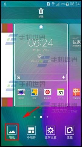 1)在桌面用雙指同時向屏幕中央合攏,喚出功能設置後,選擇【牆紙】。(如下圖)