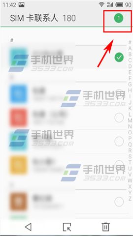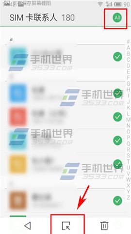 3)選擇好聯系人右側將顯示【√】,若要備份全部聯系人,則點擊SIM卡聯系人右側顯示的符號【1】,此時符號【1】將會變成【All】,每個聯系人已經標記好。(如下圖)
