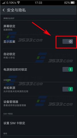 進入R7Plus的設置,在常規一欄點擊【安全與隱私】,進入後關閉【顯示圖案】右邊按鈕即可。(如下圖)