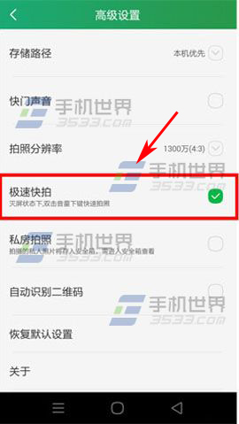 打開酷派鋒尚Pro的相機,點擊【設置】,在高級設置界面開啟【極速快拍】即可。(如下圖)