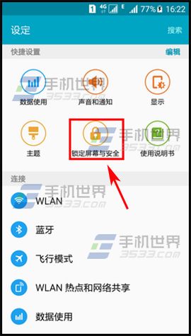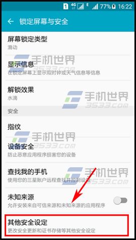 1)打開三星S6的設置進入界面,點擊【鎖定屏幕與安全】進入,點擊【其他安全設定】。(如下圖)