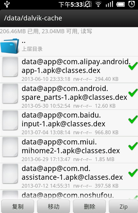 2. 打開RE文件浏覽器,將/data/dalvik-cache 這個文件夾裡面的都是系統緩存文件和卸載定制程序留下來的無用垃圾,可以放心全部刪除,系統所需文件重啟後能自動生成的,刪除後可以感覺到系統內存明顯提升,RAM內存釋放,重啟期間等待時間一到兩分鐘,期間不要有任何操作。小編實測有效,不過發現鎖屏變成默認的。