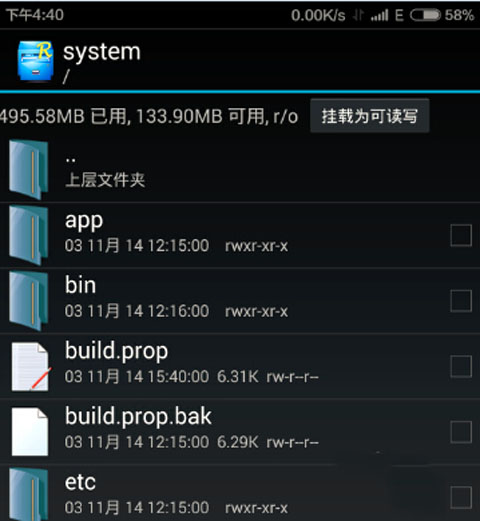打開build.prop文件(關鍵)。打開Root Explorer——system文件夾——點擊變成“掛載為可讀寫”,英文為“Mount R/W”——長按build.prop,“以文本方式編輯”,英文為“open in text editor”。