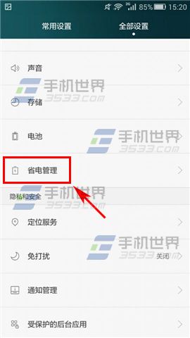 1)打開華為榮耀6plus【設置】,在【全部設置】欄中,點擊【省電管理】;(如下圖)