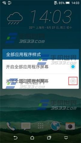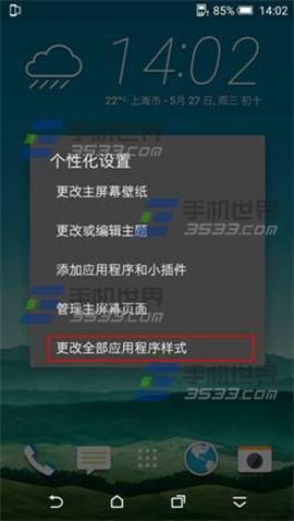 1)在HTC One M9+待機界面中點擊空白處不放,選擇【更改全部應用程序樣式】。(如下圖)