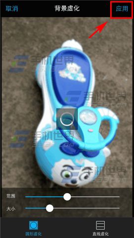 2)可選擇圓形或直線虛化,調整范圍及大小,點擊【應用】即可看到效果,最後不要忘了【保存】哦。(如下圖)