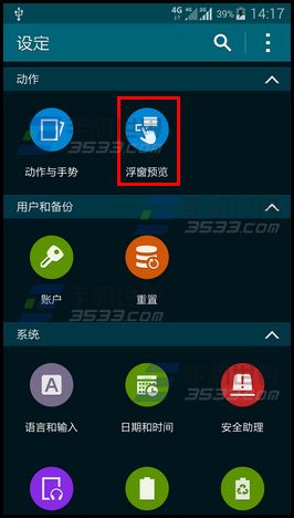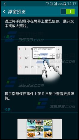 1)打開三星S6Edge的【設定】,點擊【浮窗預覽】,打開該功能;(如下圖)