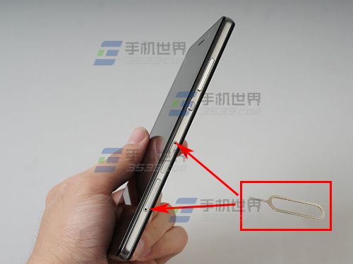 其實很簡單,只要拿買手機時送的SIM卡針捅右側機身靠下的卡座針孔,就可以彈出卡座,就可以放入SIM了。(如下圖)