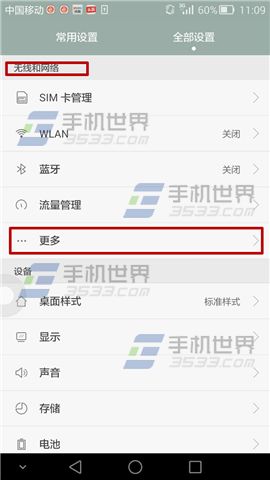 1)打開華為P8青春版的【設置】,在【全部設置】欄的【無線和網絡】分類中點擊【更多】,點擊【移動網絡】;(如下圖)