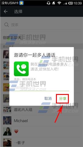 3)進入到微信的好友列表中,選擇一位好友進行【分享】,接著跳轉到多人通話頁面,等好友更新了就能加入啦,還需要添加多個好友加入通話的話,可以點擊右上角的【人頭像】進行添加哦。(如下圖)