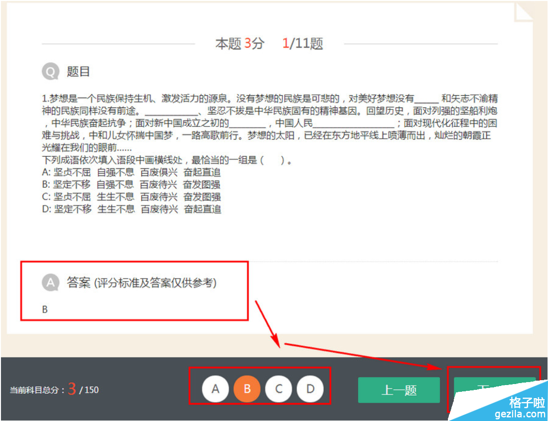 4、然後你按照你的記憶選擇你當時高考時的選項,正確答案上面也有,大家可以看看,選好之後大家選擇點擊“下一題”