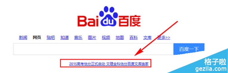1、打開百度,我們就可以看到這個了“2015高考估分正式啟動 文理全科估分百度文庫獨家”,點擊進去