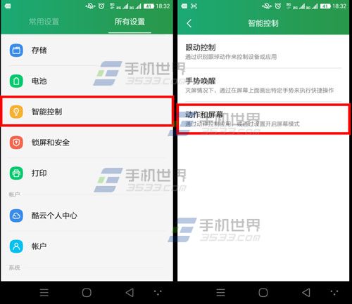1)打開大神X7【所有設置】,點擊【智能控制】,選擇【動作和屏幕】。(如下圖)