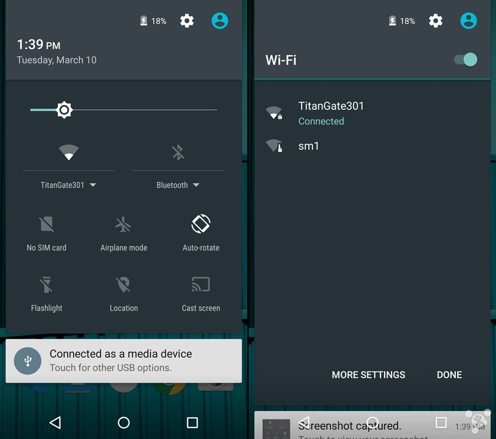 在安卓 5.1 中,Wi-Fi 快捷按鈕下面的文字旁邊增添了一個明顯的下拉三角。點擊後,會直接在通知中心羅列出 Wi-Fi 熱點列表,用戶無需進入設置菜單選擇相應的連接目標。