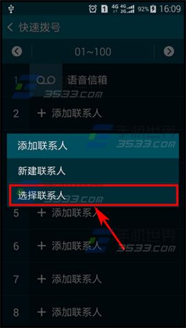 2)選擇【新建聯系人】或【選擇聯系人】,小編以【選擇聯系人】為例,選擇一個要設置成快速撥號的聯系人;(如下圖)