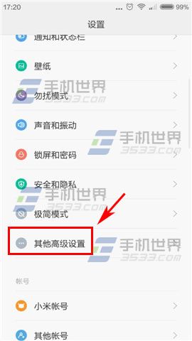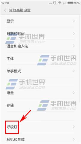 1)首先打開紅米2A界面點擊設置,然後再點擊【其他高級設置】,進入後再點擊【呼吸燈】;(如下圖)