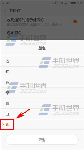 2)進入後有通知和來電以及短信的呼吸燈顏色,小編就拿【通知顏色】舉例,點擊進入後選擇顏色即可;注:其他兩種操作方式一樣。(如下圖)
