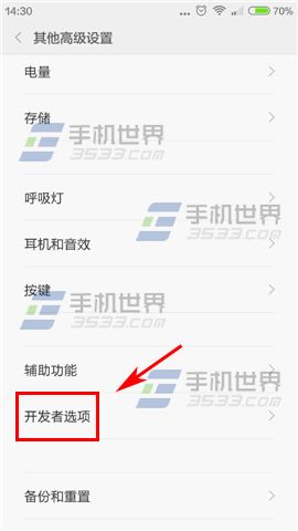 1)首先打開紅米2A界面點擊設置,然後再點擊【其他高級設置】,進入後再點擊【開發者選項】;(如下圖)