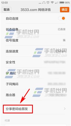 2)找到已經連接的WiFi,點擊【WiFi名稱後面的箭頭】,進入WiFi詳情,然後下拉點擊【分享密碼給朋友】;(如下圖)
