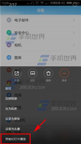 2)開啟完後返回紅米2A主頁界面點擊【圖庫】選擇一個相冊點擊照片再點擊【更多】,最後再點擊【開始幻燈片播放】即可。(如下圖)