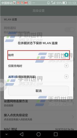 3)點擊【高級設置】,將【在休眠狀態下保持WLAN連接】調整為【始終】。(如下圖)