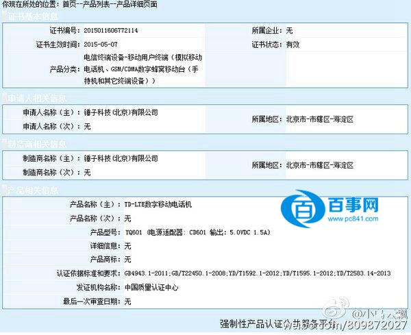 即將推出的“小錘子”手機內部編號為新機YQ601,而現在相關網站顯示,錘子科技這款小錘子已經通過國家3C質量認證,並證實為上海希姆通生產。同時根據以往的經驗,這意味著只要該機只要再拿到入網許可證,既可以正式上市,對於這款廉價的小錘子手機,簡單介紹下