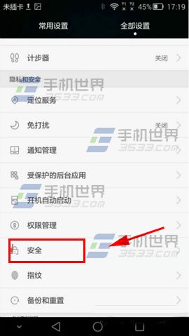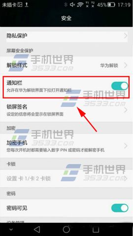 打開華為Mate7【全部設置】界面,點擊【安全】,將【通知欄】開啟即可。(如下圖)