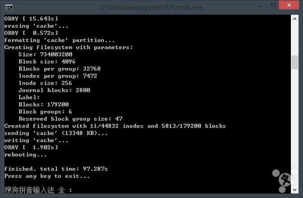 然後像平常刷機那樣,在命令行內進入刷機目錄,連接電腦,關鍵的時候就到了。
