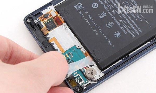小米Note機身底部配備了一體化音腔,拆解上非常簡單。從底部的揚聲器模塊上看,小米Note采用了Smart PA技術,使得外放音量和音質領先於其他小米手機。