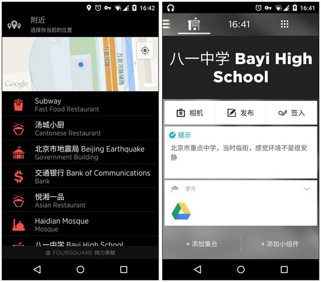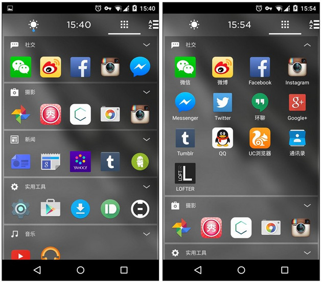 Aviate最大的特點就是分類智能化,方便查找應用。而且卡片化且扁平的設計與新版Android界面相呼應,可以與系統融為一體,非常美觀。桌面沒有繁雜的功能,一個主屏用來展示常用軟件和插件信息,一頁情景模式用來分時段提供功能規劃,以及智能分類的應用欄,把系統軟件化繁為簡,非常不易。