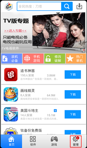 在進入到軟件首頁精選頁面中,可以發現統一安卓助手將軟件分為了首頁、軟件、游戲和管理四個部分,點擊管理軟件,如圖: