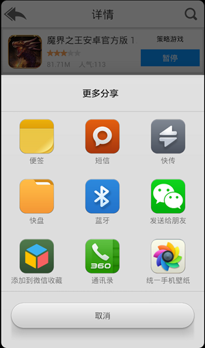 軟件正在下載中,點擊界面右下方的分享按鈕,即可把軟件分享到朋友圈中,如圖: