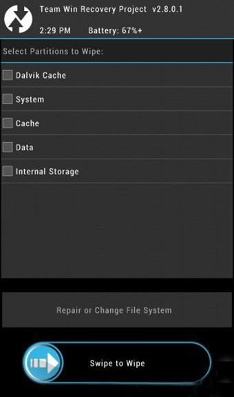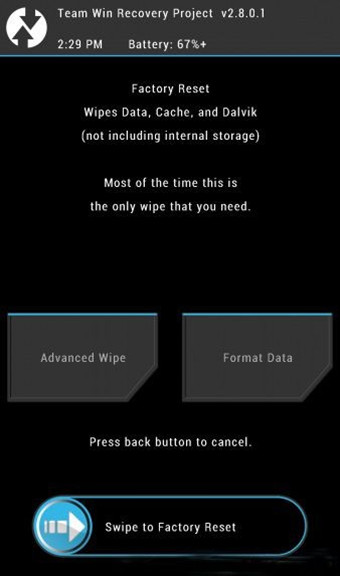 刷入ROM的方法就是,進入Wipe選項,然後滑動到底部,然後清除手機數據和緩存。如果你想選擇你想清除的數據,點擊Advanced Wipe,選擇你要清除的選項,然後滑動底部即可。