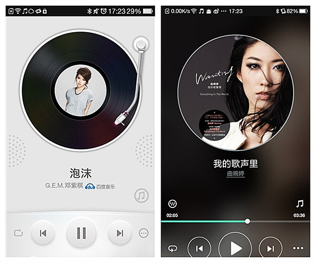 毛玻璃和扁平化集中體現之處位於系統自帶的音樂播放器,取消了唱片風格,換上更大面積的唱片海報。而且按鈕采用了扁平化設計,更加突出線條之美。
