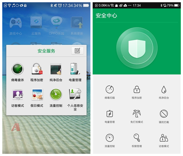 除了UI設計上的簡潔、Color OS 2.0對整個系統也進行了一番梳理,將多項安全服務集成在一起,推出了“安全中心”(現在才發現,OPPO手機原先竟沒有一個獨立的安全中心),如此以來,系統一下子少了八、九款App,潔癖症者的福音。