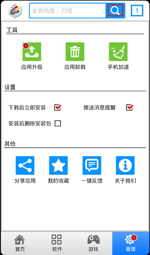 進入管理界面之後,可以在這裡進行應用升級、應用卸載和手機加速等操作,在這點擊右上方的搜索按鈕,即可進入搜索界面進行搜索,如圖: