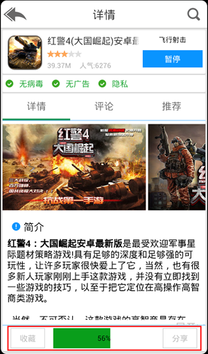 軟件正在下載中,點擊界面右下方的分享按鈕,即可把軟件分享到朋友圈中,點擊界面左邊的收藏按鈕,即可將軟件進行收藏,還可在界面下方隨時查看下載進度,如圖: