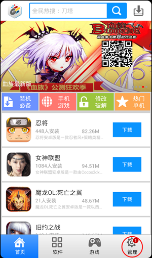 進入管理界面之後,這邊可以進行應用升級、應用卸載和手機加速等功能的操作,在這邊我們點擊右上方的搜索按鈕,就可以對軟件進行搜索了,如圖: