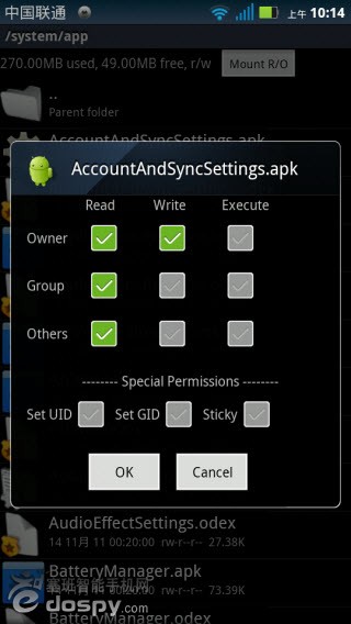 以大家最熟悉的Root Explorer文件管理器為例,我們經常需要用到菜單裡的“Permissions”選項來給文件或文件夾設置權限,而這個權限的設置界面就像是一個九宮格一樣,我們只需要在裡面勾選或者取消勾選就完成了權限的設置。