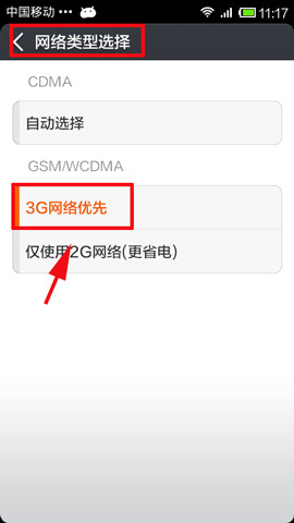 還有一種方法是打開手機的“設置”,然後點擊“移動網絡”,再點擊“網絡類型選擇”,選擇“3G網絡優先”,那麼你的安卓手機開啟3G信號就成功了。
