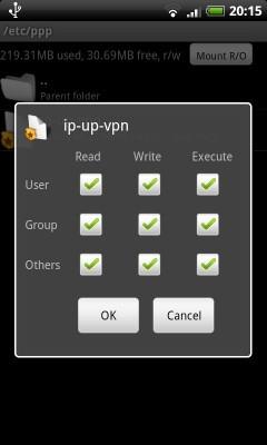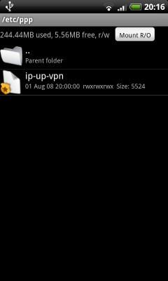 打開root explorer,定位到/etc/ppp/,點擊一下右上角的mount r/w(可寫),在ip-up-vpn上面長按彈出菜單,選Permissions;