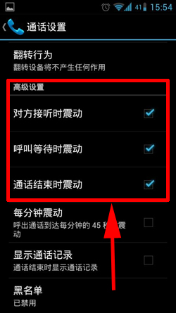 2)在通話設置頁面,找到高級設置,把“對方接聽時震動”“呼叫等待時震動”“通話結束時震動”勾選上,這樣設置就完成了。