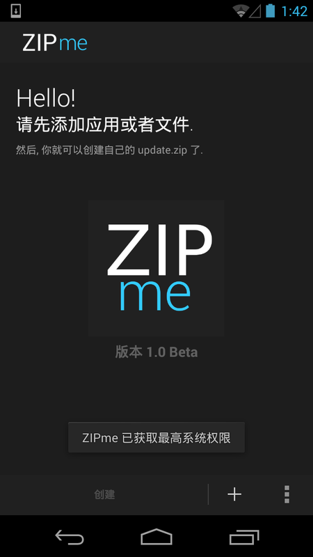 當然了,前提還是你的手機得Root了,這個刷機用戶必備的!這裡需要用到是ZIPme這個新秀,它夠在手機上制作zip卡刷包的工具,方便你刷機後恢復數據或者制作各種刷機包。比钛備份還要全面,而且自動給卡刷包簽名,所有的項目都在手機端完成,如果你知道終極備份的話,你就知道該軟件作者的實力了!