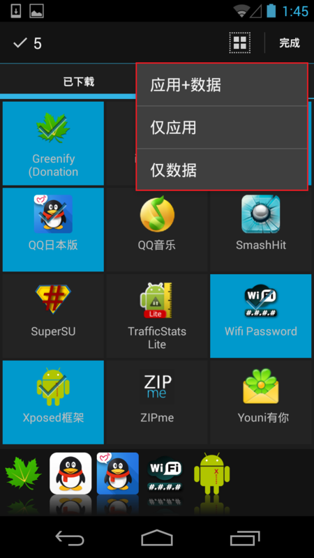 選中我們需要備份的軟件之後,點擊右上角的完成,就會彈出一個菜單,我們需要“應用+數據”或者“僅應用”、“僅數據”。