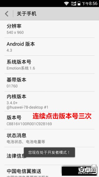 2、打開USB調試:設置--關於手機--版本號(注意,不是系統版本號),連續點擊三次,即出現開發人員選項;