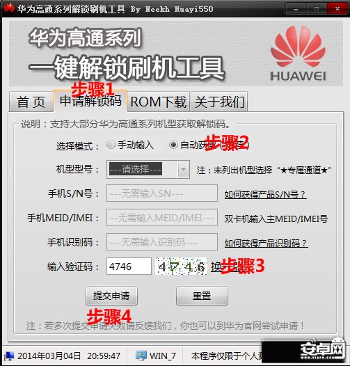 3、手機通過數據線連接電腦,打開解鎖工具,選擇“申請經解鎖碼”--“自動獲取”--“輸入驗證碼”--“提交申請”;