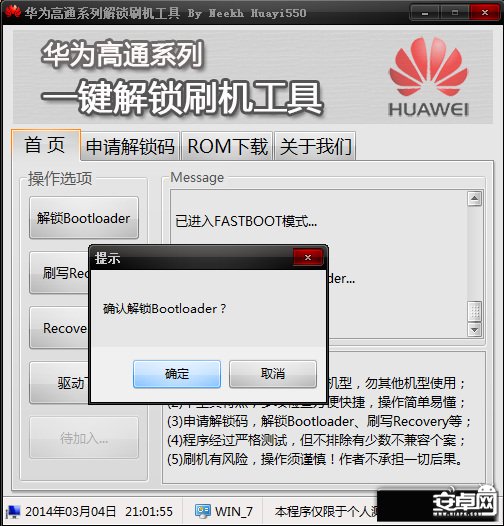 5、數據線連接電腦,打開一鍵解鎖工具,點擊“解鎖Bootloader”,點擊“確定”,出現一個對話框,輸入16位解鎖碼,點擊“確定”,一鍵解鎖工具沒有任何異常提示,手機順利重啟即解鎖成功;如圖所示: